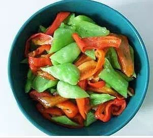 1、炒锅倒入油(比平时炒菜多一点点),大火烧至八成热,改中火,放入青椒。