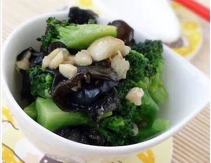 4,锅里放油烧热,放入黑木耳炒匀,加入西兰花翻炒一下;