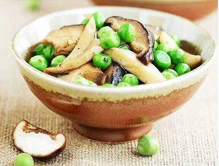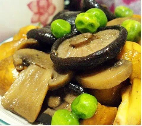 食材:杏鲍菇1个(约100克)、香菇50克、白灵菇100克、豌豆150克、生抽30ml、素蚝油15ml、色拉油30ml、黑胡椒粉2克、盐1.2克