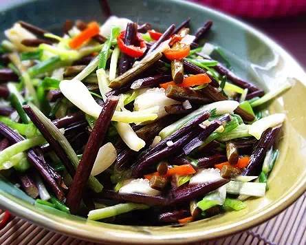 3、锅内继续添适量油烧热,倒入豇豆翻炒。