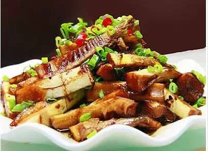 1、茶树菇剪去根蒂洗净切成两段,放入开水烫熟捞出、控干水份放入油中略炸一下