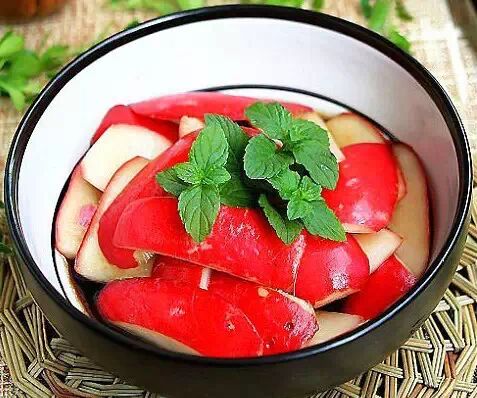 食材:萝卜,盐,糖,香醋,蘑菇粉,香油