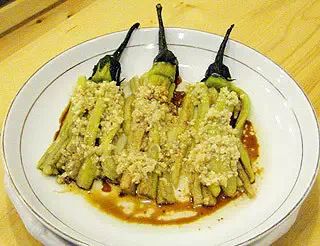 食材: 红椒;茄子、淀粉、姜末、油、素蚝油、香油、盐、醋。
