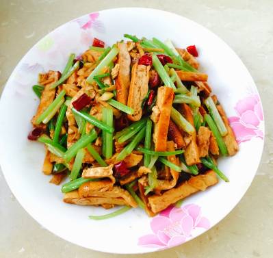 8.放入小米椒,芹菜,继续翻炒两分钟即可